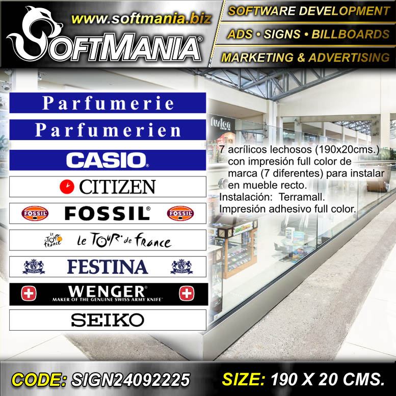 | DESCRIPTION | white acrylic 3 millimeters with cut vinyl lettering with text watch brand logos |