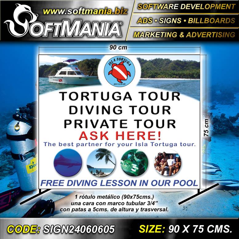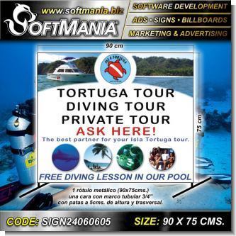 | DESCRIPTION | metal sheet of iron with tubular frame and full printing with text tortuga diving tour, ask here! |