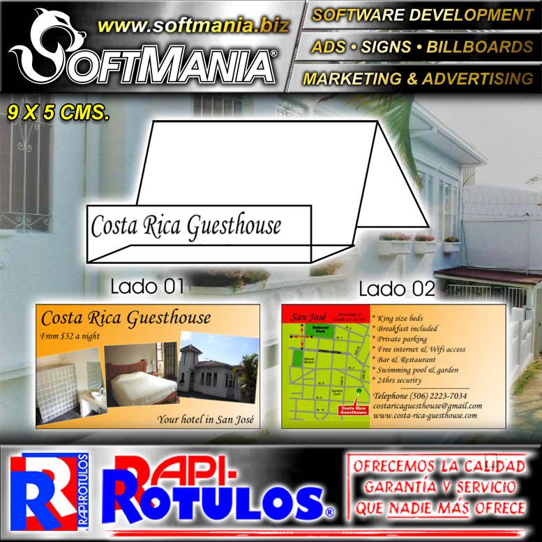 | DESCRIPTION | business cards double sided with text costa rica, backpackers and guesthouse with acrylic dispenser |