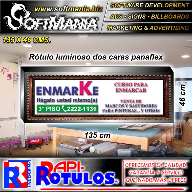 Este rotulo publicitario de la excelente marca Softmania Rotulos fue diseñado especialmente para taller de enmarcado con la mejor calidad y precio. Con el mensaje correcto para llegar a su mercado meta! Fabricado con materiales de alta durabilidad y resistencia: marco de hierro, panaflex lona traslucida, vinil de corte, luz fluorescente