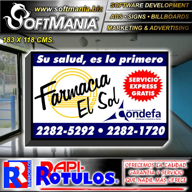 Este producto Rotulo Publicitario Luminoso Cara de Lona Vinilica Traslucida Dos Caras con Texto Farmacia el Sol para Farmacia marca Softmania Rotulos de Dimensiones 1.8x1.2 Metros y muchos mas estan disponibles al por mayor y al detalle en SOFTMANIA. Pregunta por el codigo SMRR23100204. Aprovecha grandiosas ofertas todos los dias!