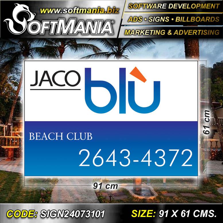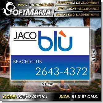 Este producto Rotulo Publicitario Acrilico Blanco 3 Milimetros Impreso Full Color con Texto Jaco Blu Beach Club para Hotel marca Softmania Ads de Dimensiones 91x61 Centimetros y muchos mas estan disponibles al por mayor y al detalle en SOFTMANIA. Pregunta por el codigo SIGN24073101. Aprovecha grandiosas ofertas todos los dias!