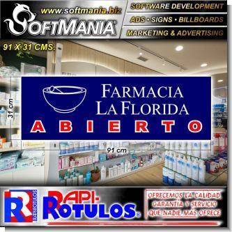 Este producto Rotulo Publicitario Plastico PVC 3 Milimetros con Rotulacion en Vinil de Corte con Texto Farmacia La Florida Abierto para Farmacia marca Softmania Rotulos de Dimensiones 91x31 Centimetros y muchos mas estan disponibles al por mayor y al detalle en SOFTMANIA. Pregunta por el codigo SMRR23100205. Aprovecha grandiosas ofertas todos los dias!