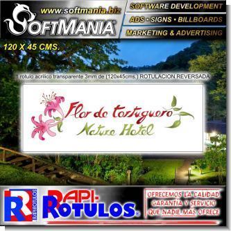 Este producto Rotulo Publicitario Acrilico Transparente con Rotulacion Reversada con Texto Flor de Tortuguero, Hotel Natural para Hotel marca Softmania Rotulos de Dimensiones 1.2x0.5 Metros y muchos mas estan disponibles al por mayor y al detalle en SOFTMANIA. Pregunta por el codigo SMRR23100312. Aprovecha grandiosas ofertas todos los dias!
