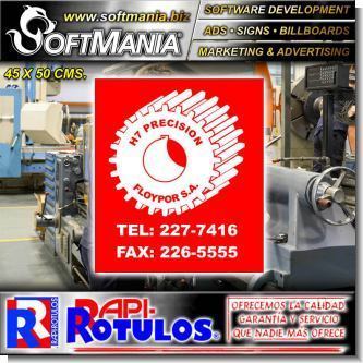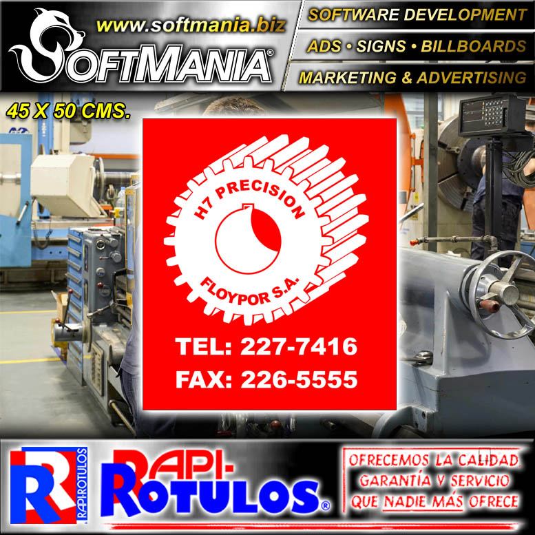 Este producto Rotulo Publicitario Lamina de Hierro con Rotulado de Vinil Adhesivo Full Color con Texto H7 Precision, Taller de Precision para Taller de Mecanica marca Softmania Rotulos de Dimensiones 45x50 Centimetros y muchos mas estan disponibles al por mayor y al detalle en SOFTMANIA. Pregunta por el codigo SMRR23100319. Aprovecha grandiosas ofertas todos los dias!