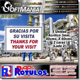 Este producto Rotulo Publicitario Lamina Metalica de Hierro con Marco de Aluminio con Texto Gracias por Su Visita para Fabrica de Quimicos marca Softmania Rotulos de Dimensiones 60x40 Centimetros y muchos mas estan disponibles al por mayor y al detalle en SOFTMANIA. Pregunta por el codigo SMRR23100321. Aprovecha grandiosas ofertas todos los dias!
