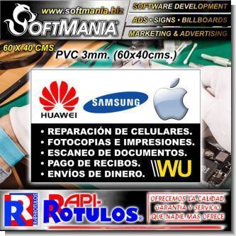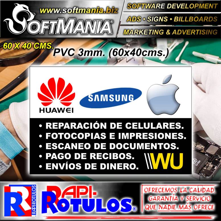 Este rotulo publicitario de la excelente marca Softmania Advertising fue diseñado especialmente para tienda de celulares y electronicos con la mejor calidad y precio. Con el mensaje correcto para llegar a su mercado meta! Fabricado con materiales de alta durabilidad y resistencia: plastico pvc 3mm, vinil de corte