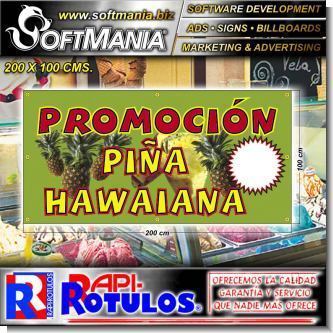 Este producto Rotulo Publicitario PVC 3 Milimetros con Rotulacion Full Color con Texto Promocion Pina Hawaiana para Heladeria marca Softmania Advertising de Dimensiones 2x1 Metros y muchos mas estan disponibles al por mayor y al detalle en SOFTMANIA. Pregunta por el codigo SMRR24012904. Aprovecha grandiosas ofertas todos los dias!