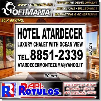 Este rotulo publicitario de la excelente marca Softmania Advertising fue diseñado especialmente para hotel con la mejor calidad y precio. Con el mensaje correcto para llegar a su mercado meta! Fabricado con materiales de alta durabilidad y resistencia: plastico corrugado, vinil de corte, ojetes de acero