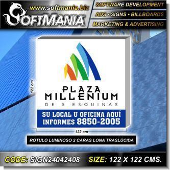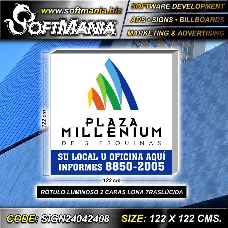 Este producto Rotulo Publicitario Luminoso Cara de Lona Vinilica Traslucida Dos Caras con Texto Plaza Millenium, Su Local u Oficina Aqui para Centro Comercial marca Softmania Ads de Dimensiones 1.2x1.2 Metros y muchos mas estan disponibles al por mayor y al detalle en SOFTMANIA. Pregunta por el codigo SIGN24042408. Aprovecha grandiosas ofertas todos los dias!