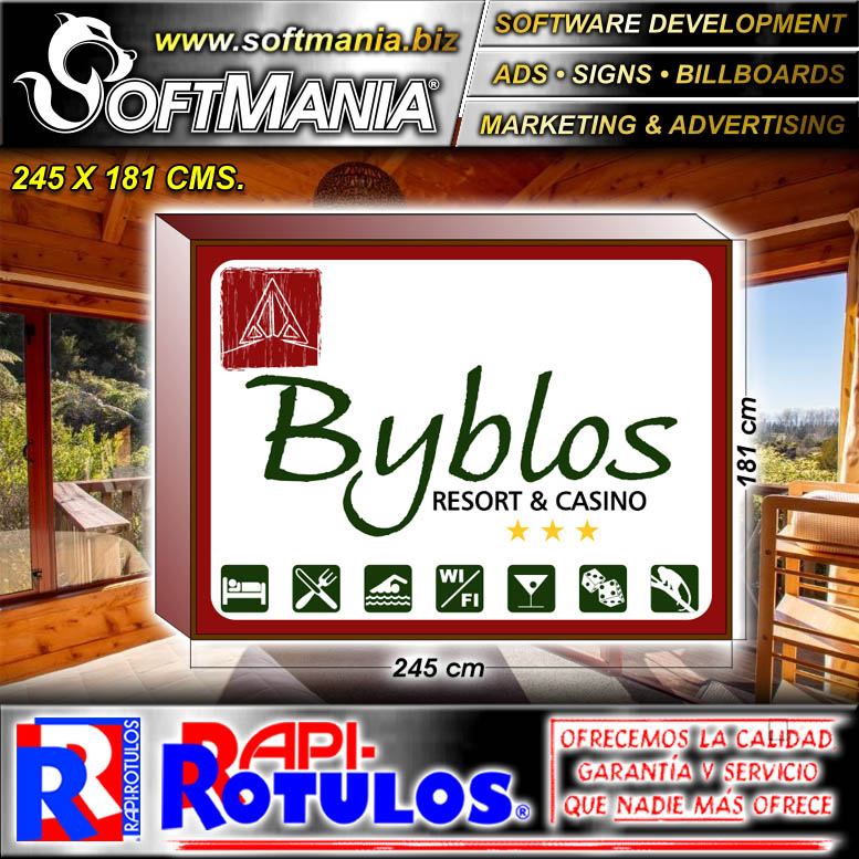 Este producto Rotulo Publicitario Luminoso Cara de Lona Vinilica Traslucida Dos Caras con Texto Byblos Resort and Casino para Hotel marca Softmania Advertising de Dimensiones 2.5x1.8 Metros y muchos mas estan disponibles al por mayor y al detalle en SOFTMANIA. Pregunta por el codigo SMRR24012940. Aprovecha grandiosas ofertas todos los dias!
