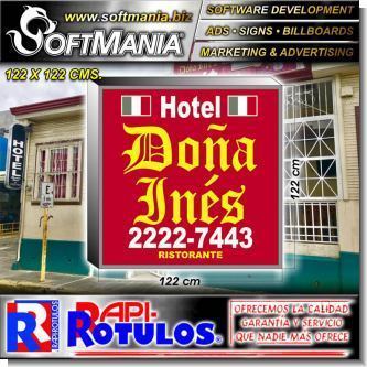 Este rotulo publicitario de la excelente marca Softmania ADS fue diseñado especialmente para hotel con la mejor calidad y precio. Con el mensaje correcto para llegar a su mercado meta! Fabricado con materiales de alta durabilidad y resistencia: marco de hierro, panaflex lona traslucida, vinil de corte, luz fluorescente