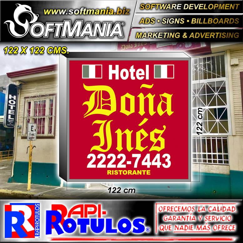 Este producto Rotulo Publicitario Luminoso Cara de Lona Vinilica Traslucida Dos Caras con Texto Hotel Dona Ines Ristorante para Hotel marca Softmania Ads de Dimensiones 1.2x1.2 Metros y muchos mas estan disponibles al por mayor y al detalle en SOFTMANIA. Pregunta por el codigo SMRR24012950. Aprovecha grandiosas ofertas todos los dias!