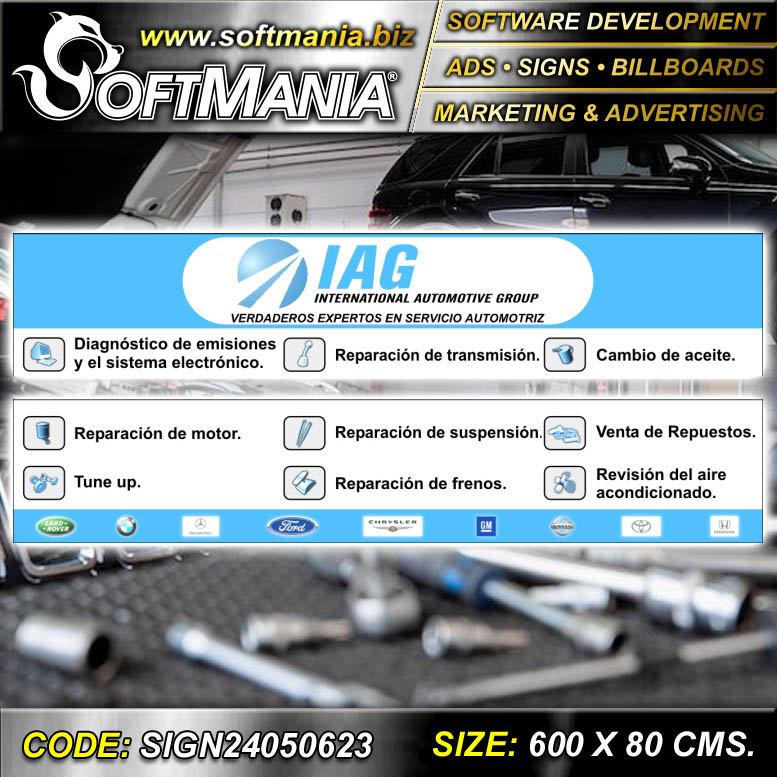 Este producto Rotulo Publicitario Lamina de Hierro con Rotulado de Vinil Adhesivo Full Color con Texto Iag, Grupo Internacional de Automoviles para Taller de Mecanica marca Softmania Ads de Dimensiones 6x0.8 Metros y muchos mas estan disponibles al por mayor y al detalle en SOFTMANIA. Pregunta por el codigo SIGN24050623. Aprovecha grandiosas ofertas todos los dias!