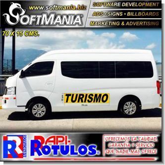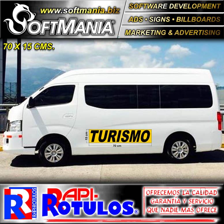 Este producto Rotulo Publicitario Publicidad para Flotilla Vehicular de Empresa Dos Caras con Texto Rutulacion Reglamentaria Microbus de Turismo para Empresa de Turismo marca Softmania Rotulos de Dimensiones 70x15 Centimetros y muchos mas estan disponibles al por mayor y al detalle en SOFTMANIA. Pregunta por el codigo SMRR23100119. Aprovecha grandiosas ofertas todos los dias!