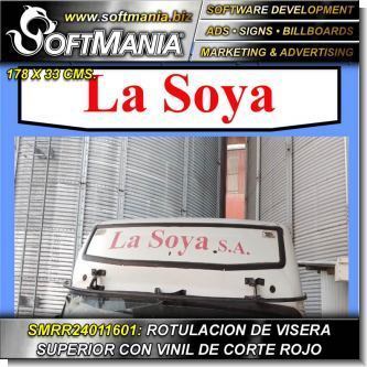 Este producto Rotulo Publicitario Adhesivo para Visera Superior de Vehiculo con Texto La Soya para Fabrica de Alimentos marca Softmania Advertising de Dimensiones 1.8x0.3 Metros y muchos mas estan disponibles al por mayor y al detalle en SOFTMANIA. Pregunta por el codigo SMRR24011601. Aprovecha grandiosas ofertas todos los dias!