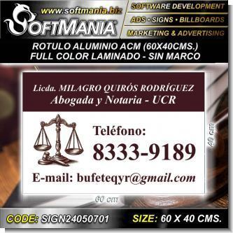 Este producto Rotulo Publicitario Aluminio Acm 4mm con Rotulacion en Full Color con Texto Abogada y Notaria Universidad de Costa Rica Ucr para Bufete de Abogados marca Softmania Ads de Dimensiones 60x40 Centimetros y muchos mas estan disponibles al por mayor y al detalle en SOFTMANIA. Pregunta por el codigo SIGN24050701. Aprovecha grandiosas ofertas todos los dias!