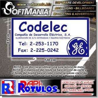 Este producto ROTULO PUBLICITARIO LAMINA METALICA DE HIERRO CON MARCO TUBULAR Y ROTULACION EN VINIL DE CORTE DOS CARAS CON TEXTO CODELEC ILUMINACION DE ALTA INTENSIDAD Y EQUIPOS ELECTRICOS PARA TIENDA DE ELECTRODOMESTICOS MARCA SOFTMANIA ADVERTISING DE DIMENSIONES 1.2X0.6 METROS y muchos mas estan disponibles al por mayor y al detalle en SOFTMANIA. Pregunta por el codigo SMRR23051002. Aprovecha grandiosas ofertas todos los dias!