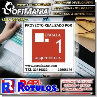 Este producto Rotulo Publicitario Lamina de Hierro con Rotulado de Vinil Adhesivo Full Color con Texto Proyecto Realizado por Escala 1 para Oficina de Arquitectos marca Softmania Rotulos de Dimensiones 1.2x1.2 Metros y muchos mas estan disponibles al por mayor y al detalle en SOFTMANIA. Pregunta por el codigo SMRR23100109. Aprovecha grandiosas ofertas todos los dias!