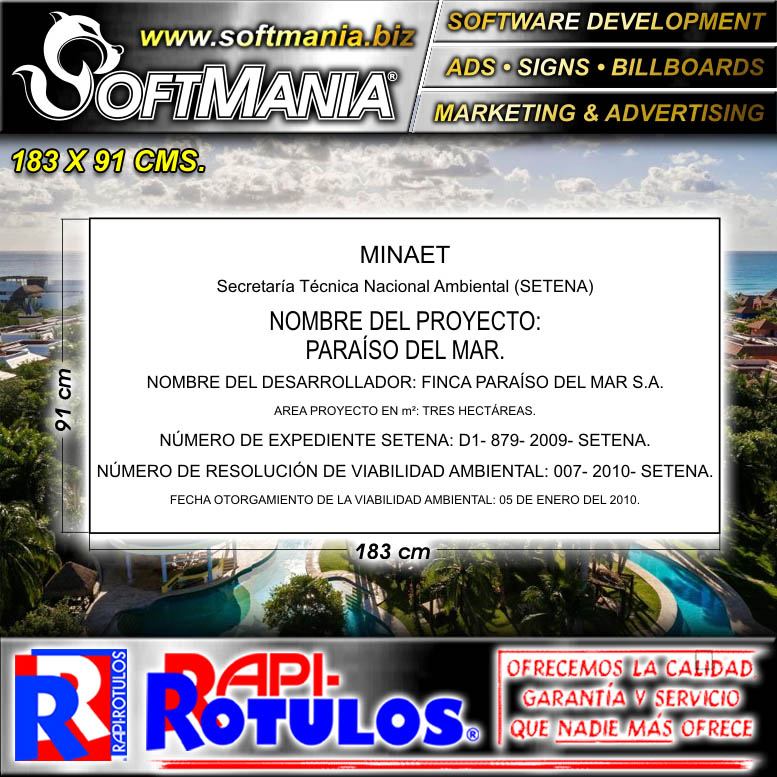 Este producto Rotulo Publicitario Luminoso con Marco de Aluminio de Cara Acrilica con Texto Rotulacion Reglamentaria Setena Minaet para Empresa Constructora marca Softmania Rotulos de Dimensiones 0.9x1.5 Metros y muchos mas estan disponibles al por mayor y al detalle en SOFTMANIA. Pregunta por el codigo SMRR23100306. Aprovecha grandiosas ofertas todos los dias!