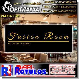 Este producto Rotulo Publicitario Lamina de Hierro con Rotulado de Vinil Adhesivo Full Color con Texto Fusion Room, Restaurant and Lounge para Restaurante marca Softmania Rotulos de Dimensiones 2.4x1 Metros y muchos mas estan disponibles al por mayor y al detalle en SOFTMANIA. Pregunta por el codigo SMRR23102524. Aprovecha grandiosas ofertas todos los dias!