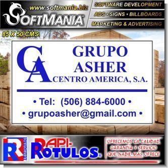 Este producto Rotulo Publicitario Lamina de Hierro con Rotulado de Vinil Adhesivo Full Color con Texto Grupo Asher, Centro America para Bienes Raices marca Softmania Advertising de Dimensiones 85x50 Centimetros y muchos mas estan disponibles al por mayor y al detalle en SOFTMANIA. Pregunta por el codigo SMRR23113008. Aprovecha grandiosas ofertas todos los dias!