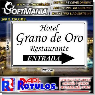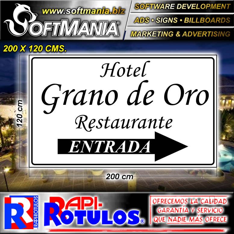 Este producto Rotulo Publicitario Lamina de Hierro con Rotulado de Vinil de Corte con Texto Hotel Grano de Oro, Restaurante para Hotel marca Softmania Ads de Dimensiones 2x1.2 Metros y muchos mas estan disponibles al por mayor y al detalle en SOFTMANIA. Pregunta por el codigo SMRR24012962. Aprovecha grandiosas ofertas todos los dias!