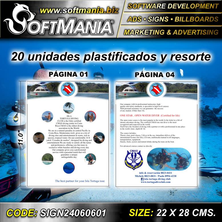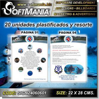 Papeleria Comercial Volante Promocional de Carton Impreso Full Color Dos Caras con Texto Descripcion del Curso de Buceo Paginas 2 y 3 para Escuela de Buceo marca Softmania Ads de Dimensiones 22x28 Centimetros