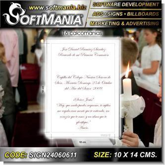Este producto Papeleria Comercial Calcomania de Papel Adhesiva con Impresion a Todo Color con Texto Recuerdo de Primera Comunion para Evento Familiar marca Softmania Ads de Dimensiones 10x14 Centimetros y muchos mas estan disponibles al por mayor y al detalle en SOFTMANIA. Pregunta por el codigo SIGN24060611. Aprovecha grandiosas ofertas todos los dias!