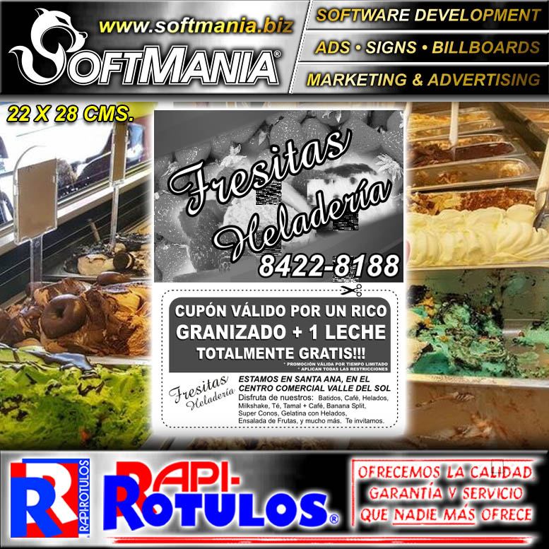Este producto Papeleria Comercial Volante Promocional de Carton Impreso Full Color con Texto Heladeria Fresitas, Cupon de Ofertas para Heladeria marca Softmania Rotulos de Dimensiones 22x28 Centimetros y muchos mas estan disponibles al por mayor y al detalle en SOFTMANIA. Pregunta por el codigo SMRR23100341. Aprovecha grandiosas ofertas todos los dias!