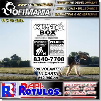 | DESCRIPCION | volante promocional impresion laser con laminado uv en papel couche con texto guato box, dispensadores de bolsas para excrementos de mascota |
