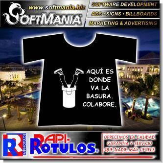 Papeleria Comercial Estampado en Serigrafia Sobre Camisetas y Uniformes con Texto Aqui Es Donde Va La Basura, Colabore para Hotel marca Softmania Ads