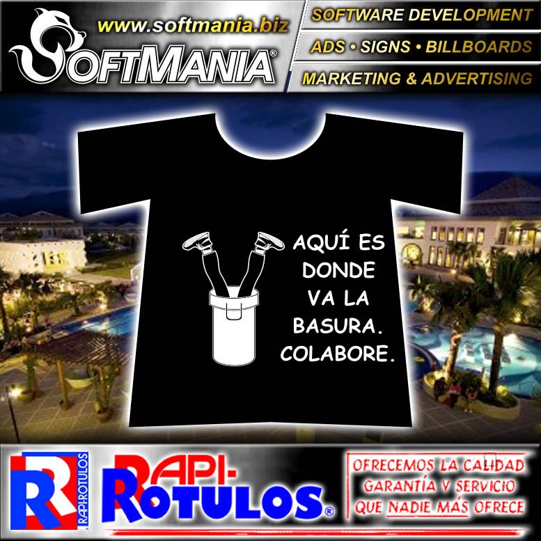 papeleria publicidad impresa comercial estampado serigrafia camisetas uniformes texto aqui donde va basura colabore hotel marca softmania ads entrega domicilio