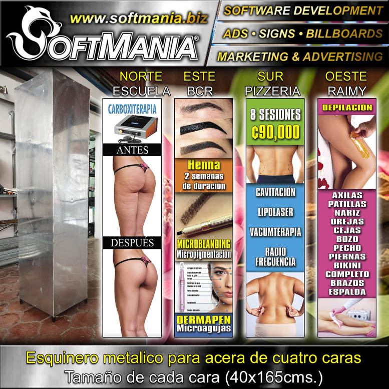| DESCRIPCION | estructura de metal para acera con rotulacion en full color dos caras con texto descripcion de un servicio en cada una de las cuatro caras |