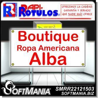 Este producto ROTULO PUBLICITARIO BANNER FULL COLOR CON OJETES DE METAL PARA AMARRAR CON TEXTO ROPA AMERICANA ALBA PARA TIENDA BOUTIQUE MARCA RAPIROTULOS DE DIMENSIONES 1X0.5 METROS y muchos mas estan disponibles al por mayor y al detalle en SOFTMANIA. Pregunta por el codigo SMRR22121503. Aprovecha grandiosas ofertas todos los dias!