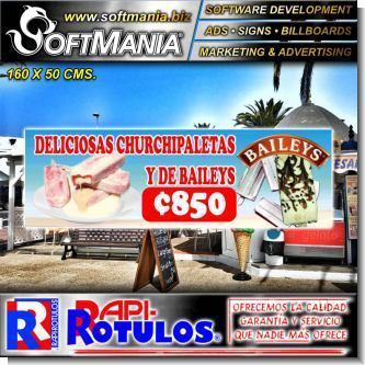 Este producto Rotulo Publicitario Banner Full Color con Ojetes de Metal para Amarrar con Texto Deliciosas Churchipaletas y de Baileys para Heladeria marca Softmania Rotulos de Dimensiones 1.6x0.5 Metros y muchos mas estan disponibles al por mayor y al detalle en SOFTMANIA. Pregunta por el codigo SMRR23090319. Aprovecha grandiosas ofertas todos los dias!