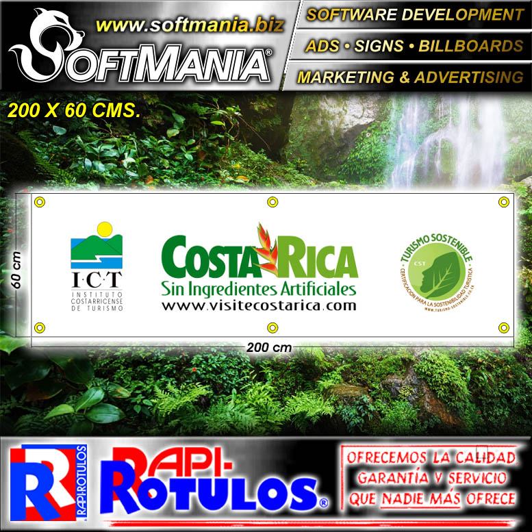 Este producto Rotulo Publicitario Banner Full Color con Ojetes de Metal para Amarrar con Texto Costa Rica sin Ingredientes Artificiales para Empresa de Turismo marca Softmania Rotulos de Dimensiones 2x0.6 Metros y muchos mas estan disponibles al por mayor y al detalle en SOFTMANIA. Pregunta por el codigo SMRR23100116. Aprovecha grandiosas ofertas todos los dias!