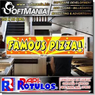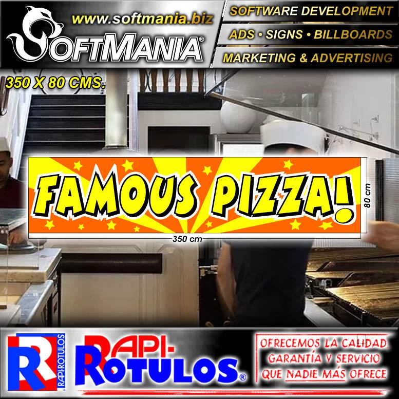 Este producto Rotulo Publicitario Banner Full Color con Ojetes de Metal para Amarrar con Texto Famous Pizza para Pizzeria marca Softmania Rotulos de Dimensiones 3.5x0.8 Metros y muchos mas estan disponibles al por mayor y al detalle en SOFTMANIA. Pregunta por el codigo SMRR23100201. Aprovecha grandiosas ofertas todos los dias!