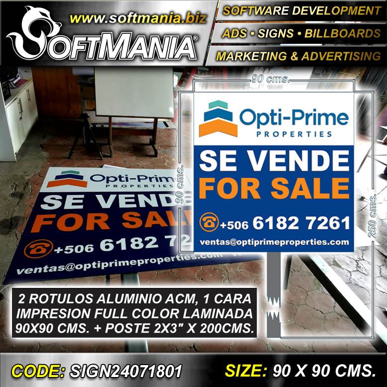 Este producto Rotulo Publicitario Aluminio Acm 4mm con Poste de 1.5x1.5 Pulgadas X 200 Centimetros con Texto Opti Prime Se Vende para Bienes Raices marca Softmania Ads de Dimensiones 90x90 Centimetros y muchos mas estan disponibles al por mayor y al detalle en SOFTMANIA. Pregunta por el codigo SIGN24071801. Aprovecha grandiosas ofertas todos los dias!
