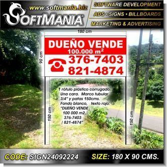 Este producto Rotulo Publicitario Plastico Corrugado Una Cara con Marco Tubular y Pata de Tubo con Texto Dueno Vende 100 Mil Metros Cuadrados para Bienes Raices marca Softmania Ads de Dimensiones 1.8x0.9 Metros y muchos mas estan disponibles al por mayor y al detalle en SOFTMANIA. Pregunta por el codigo SIGN24092224. Aprovecha grandiosas ofertas todos los dias!