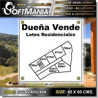 Este producto Rotulo Publicitario Banner de Vinil de Corte con Ojetes de Metal para Amarrar con Texto Duena Vende, Lotes Residenciales para Bienes Raices marca Softmania Ads de Dimensiones 60x60 Centimetros y muchos mas estan disponibles al por mayor y al detalle en SOFTMANIA. Pregunta por el codigo SIGN24092404. Aprovecha grandiosas ofertas todos los dias!