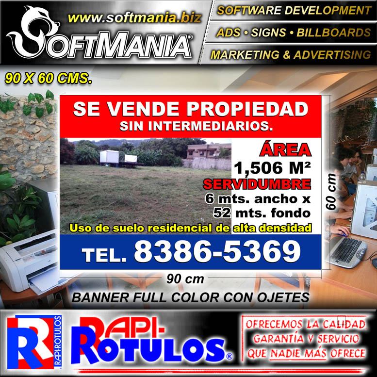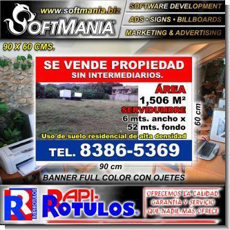 Este rotulo publicitario de la excelente marca Softmania Rotulos fue diseñado especialmente para bienes raices con la mejor calidad y precio. Con el mensaje correcto para llegar a su mercado meta! Fabricado con materiales de alta durabilidad y resistencia: vinil de corte, lona vinilica, ojetes de acero, cuerda para amarrar