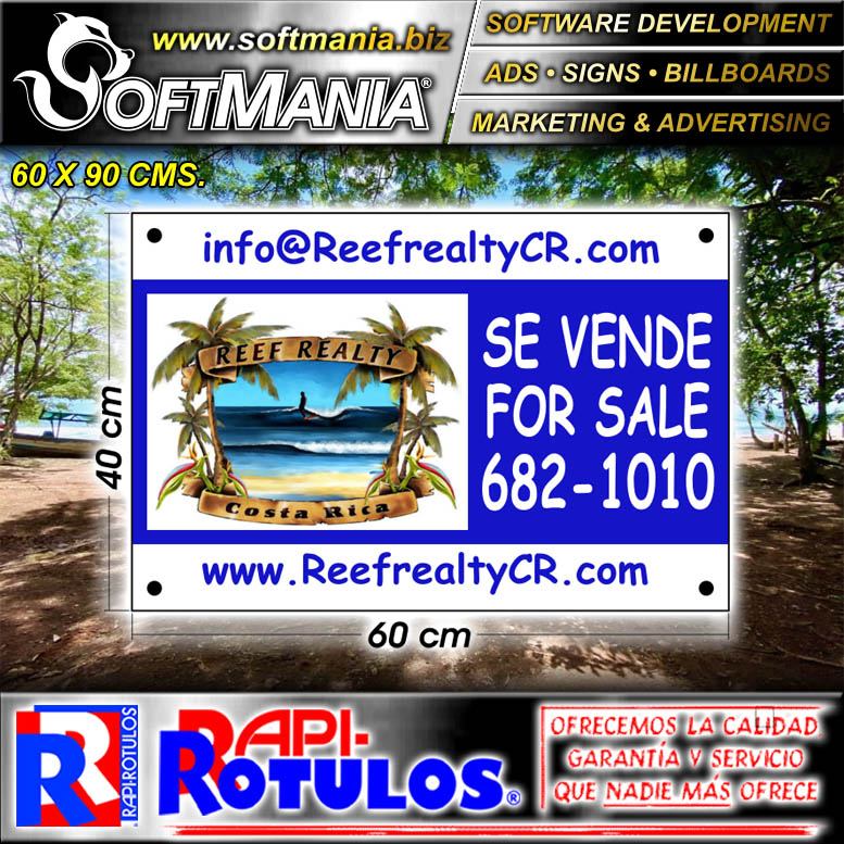 Este producto Rotulo Publicitario Lamina de Hierro con Rotulado de Vinil de Corte con Texto Reef Realty, Se Vende para Bienes Raices marca Softmania Ads de Dimensiones 60x40 Centimetros y muchos mas estan disponibles al por mayor y al detalle en SOFTMANIA. Pregunta por el codigo SMRR24012964. Aprovecha grandiosas ofertas todos los dias!