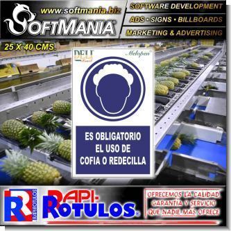 Este producto Rotulo Publicitario PVC 3 Milimetros con Rotulacion Full Color con Texto Es Obligatorio el Uso de Cofia o Redecilla para Planta Empacadora de Frutas marca Softmania Rotulos de Dimensiones 25x40 Centimetros y muchos mas estan disponibles al por mayor y al detalle en SOFTMANIA. Pregunta por el codigo SMRR23090340. Aprovecha grandiosas ofertas todos los dias!