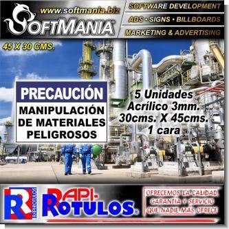 Este producto Material Publicitario Acrilico Blanco 3 Milimetros con Rotulacion en Vinil de Corte con Texto Precaucion, Manipulacion de Materiales Peligrosos para Fabrica de Quimicos marca Softmania Rotulos de Dimensiones 45x30 Centimetros y muchos mas estan disponibles al por mayor y al detalle en SOFTMANIA. Pregunta por el codigo SMRR23100322. Aprovecha grandiosas ofertas todos los dias!