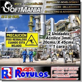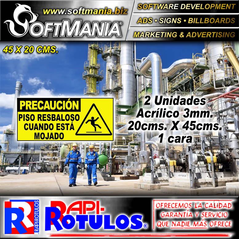 Este producto Material Publicitario Acrilico Blanco 3 Milimetros con Rotulacion en Vinil de Corte con Texto Precaucion, Piso Resbaloso Cuando Esta Mojado para Fabrica de Quimicos marca Softmania Rotulos de Dimensiones 45x20 Centimetros y muchos mas estan disponibles al por mayor y al detalle en SOFTMANIA. Pregunta por el codigo SMRR23100326. Aprovecha grandiosas ofertas todos los dias!