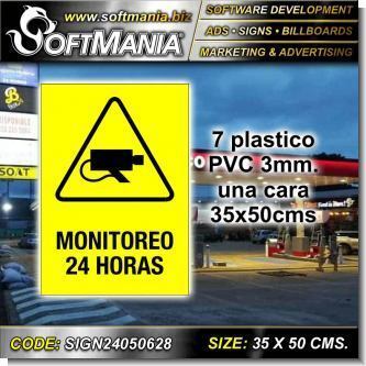 Este producto Material Publicitario Plastico PVC 3 Milimetros con Rotulacion en Vinil de Corte con Texto Monitoreo 24 Horas para Bomba de Gasolina marca Softmania Ads de Dimensiones 35x50 Centimetros y muchos mas estan disponibles al por mayor y al detalle en SOFTMANIA. Pregunta por el codigo SIGN24050628. Aprovecha grandiosas ofertas todos los dias!