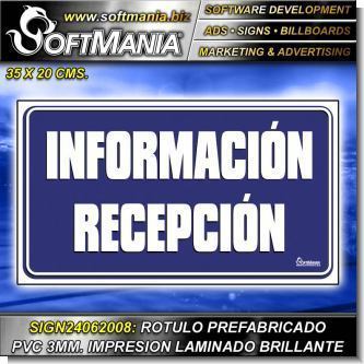 Este producto Material Publicitario Prefabricado PVC 3 Milimetros con Texto Informacion Recepcion para Asociacion Deportiva marca Softmania Ads de Dimensiones 35x20 Centimetros y muchos mas estan disponibles al por mayor y al detalle en SOFTMANIA. Pregunta por el codigo SIGN24062008. Aprovecha grandiosas ofertas todos los dias!