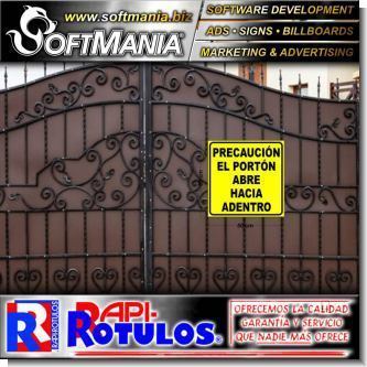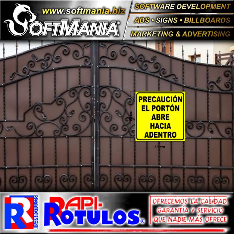 Este producto ROTULO PUBLICITARIO LAMINA DE HIERRO CON ROTULADO DE VINIL ADHESIVO FULL COLOR CON TEXTO EL PORTON ABRE HACIA ADENTRO PARA CASA DE FAMILIA MARCA SOFTMANIA ROTULOS DE DIMENSIONES 50X50 CENTIMETROS y muchos mas estan disponibles al por mayor y al detalle en SOFTMANIA. Pregunta por el codigo SMRR23082901. Aprovecha grandiosas ofertas todos los dias!