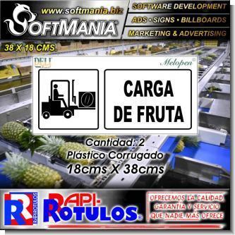Este producto Rotulo Publicitario PVC 3 Milimetros con Rotulacion Full Color con Texto Carga de Fruta para Planta Empacadora de Frutas marca Softmania Rotulos de Dimensiones 38x18 Centimetros y muchos mas estan disponibles al por mayor y al detalle en SOFTMANIA. Pregunta por el codigo SMRR23090378. Aprovecha grandiosas ofertas todos los dias!